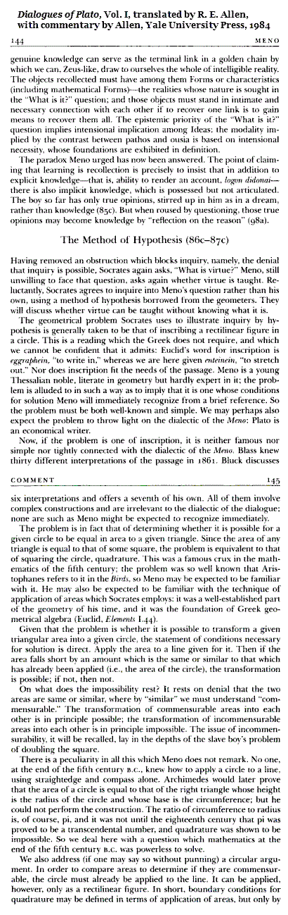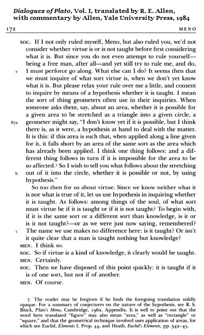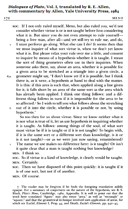 [87a] whether a certain area is capable of being inscribed as a triangular space in a given circle: they reply—“I cannot yet tell whether it has that capability; but I think, if I may put it so, that I have a certain helpful hypothesis for the problem, and it is as follows: If this area is such that when you apply it to the given line of the circle you find it falls short by a space similar to that which you have just applied, then I take it you have one consequence, and if it is impossible for it to fall so, then some other. Accordingly I wish to put a hypothesis, before I state our conclusion as regards inscribing this figure [87b] in the circle by saying whether it is impossible or not.” In the same way with regard to our question about virtue, since we do not know either what it is or what kind of thing it may be, we had best make use of a hypothesis in considering whether it can be taught or not, as thus: what kind of thing must virtue be in the class of mental properties, so as to be teachable or not? In the first place, if it is something dissimilar or similar to knowledge, is it taught or not—or, as we were saying just now, remembered? Let us have no disputing about the choice of a name: [87c] is it taught? Or is not this fact plain to everyone—that the one and only thing taught to men is knowledge?