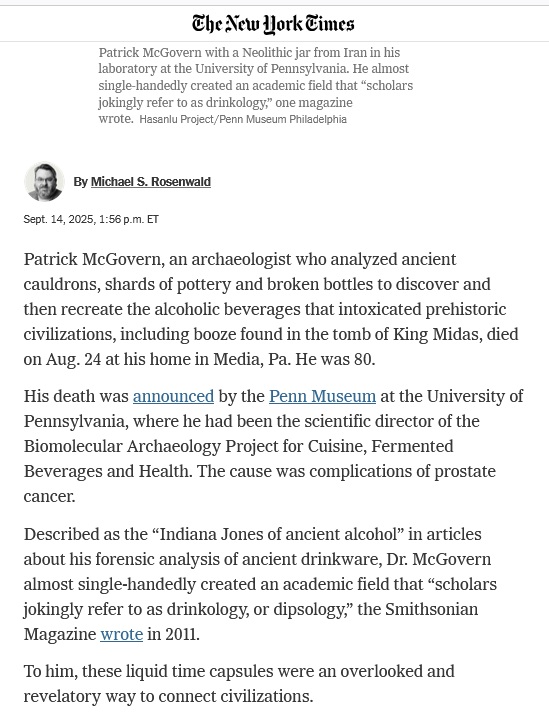 "Patrick McGovern, the ‘Indiana Jones of Ancient Alcohol,’ Dies at 80"
