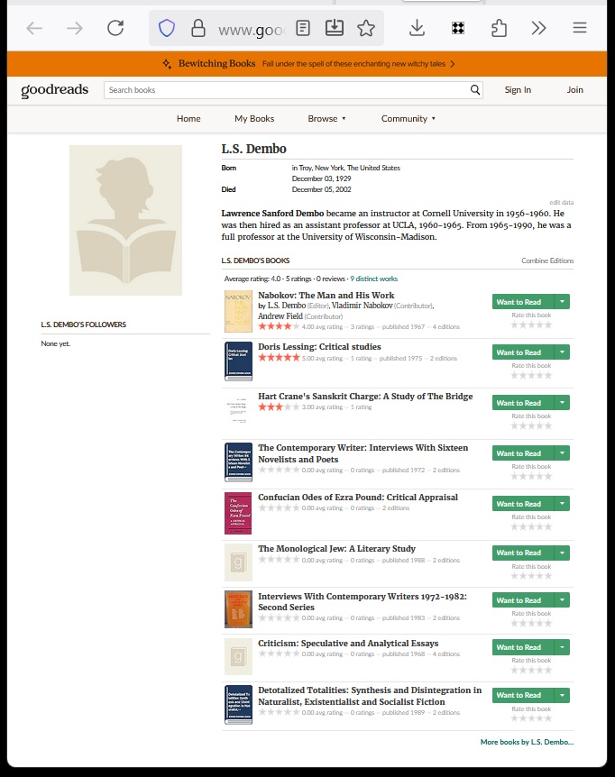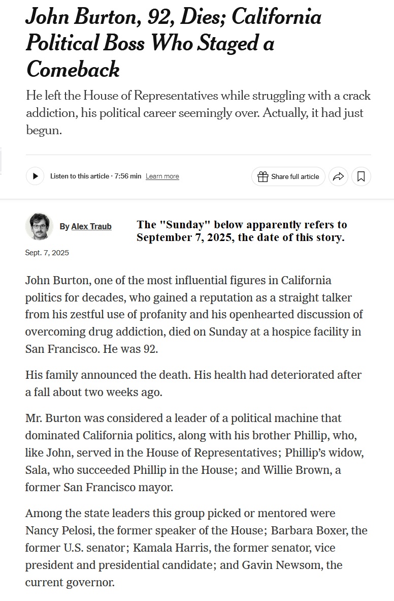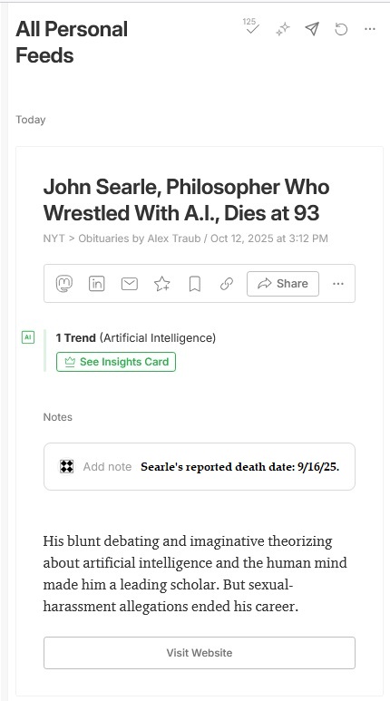 The New York Times reports today that Searle died on September 16, 2025.