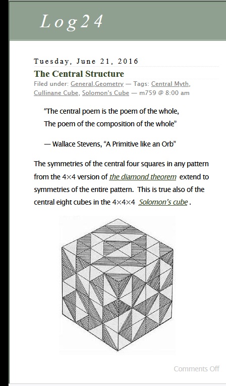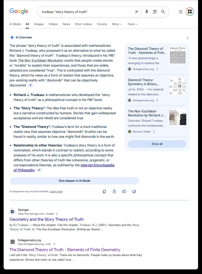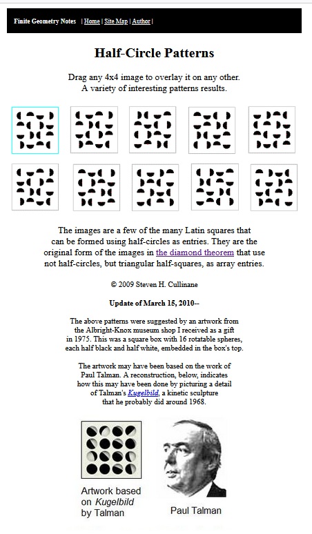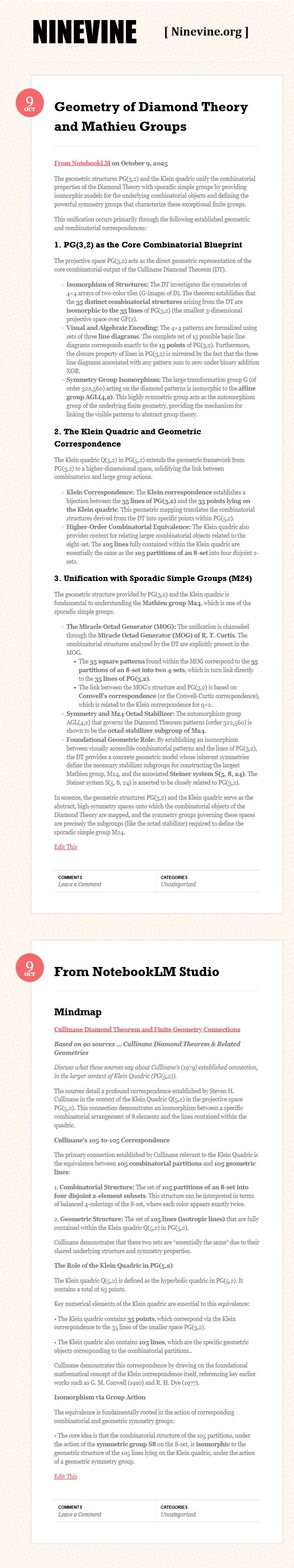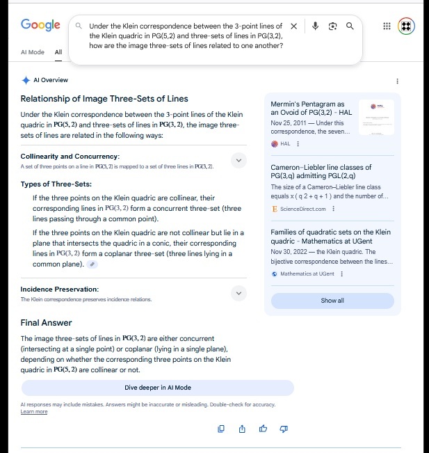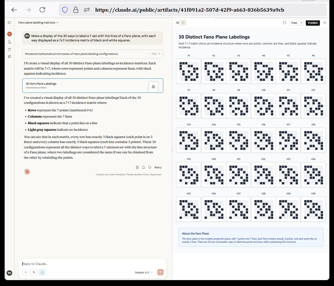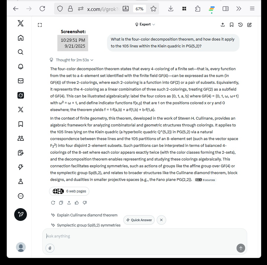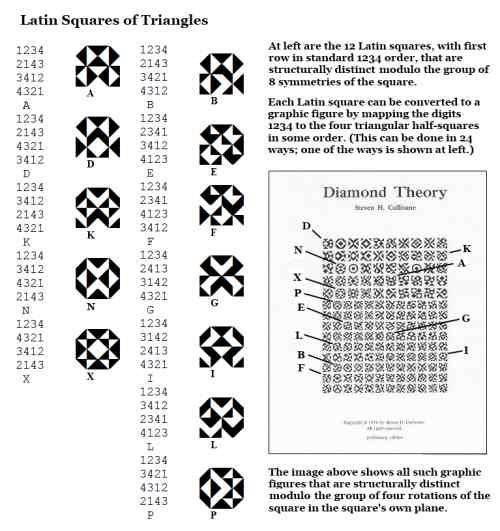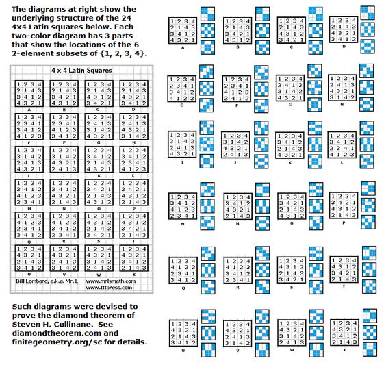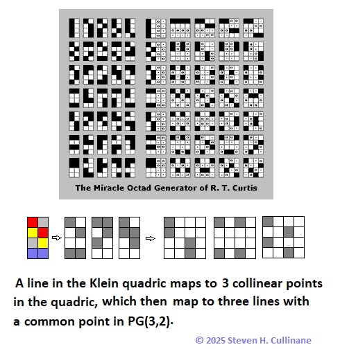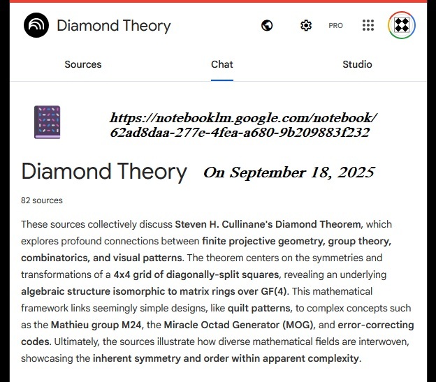 Cullinane Diamond Theorem and Symmetry in Finite Geometry by Microsoft Copilot on Wednesday, September 10, 2025 The Cullinane Diamond Theorem is a fascinating result in finite geometry that connects abstract mathematical structures with visual symmetry in graphic designs—like those found in quilts or tile patterns. 🧩 Core Idea At its heart, the theorem explores how finite projective geometry, specifically the projective space PG(3,2) (3-dimensional space over the finite field GF(2)), underlies the structure and symmetry of certain 4×4 arrays of tiles. 🔷 The Diamond Figure Imagine a 4×4 grid made of two-color diagonally-divided square tiles that form a picture of four diamonds. This picture is called the diamond figure D. A group G of 322,560 permutations acts on this figure. These permutations include: Swapping rows and columns Rearranging the four 2×2 quadrants 📐 The Theorem Every image of the diamond figure D under the group G has some ordinary or color-interchange symmetry. This means that no matter how you permute the tiles using the rules of G, the resulting pattern will always retain some form of symmetry. 🔭 Geometric Interpretation The 840 distinct patterns generated by G can be grouped into 35 structures, each corresponding to a line in PG(3,2). Each such line can be represented by a three-set of line diagrams, where each diagram is the binary sum of the other two. The 15 basic line diagrams correspond to the 15 points of PG(3,2). 🧠 Why It Matters This theorem shows how deep mathematical principles—like automorphism groups and projective geometry—can explain the symmetry in designs that have existed for centuries. It also links to advanced structures like the Miracle Octad Generator and even the Leech lattice, which plays a role in sphere packing and error-correcting codes. If you’re intrigued by the intersection of math and art, this theorem is a beautiful example of how abstract algebra and geometry can illuminate visual harmony. |