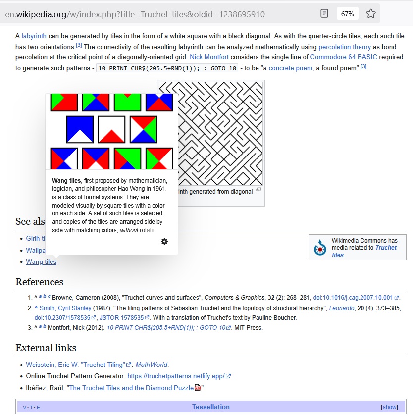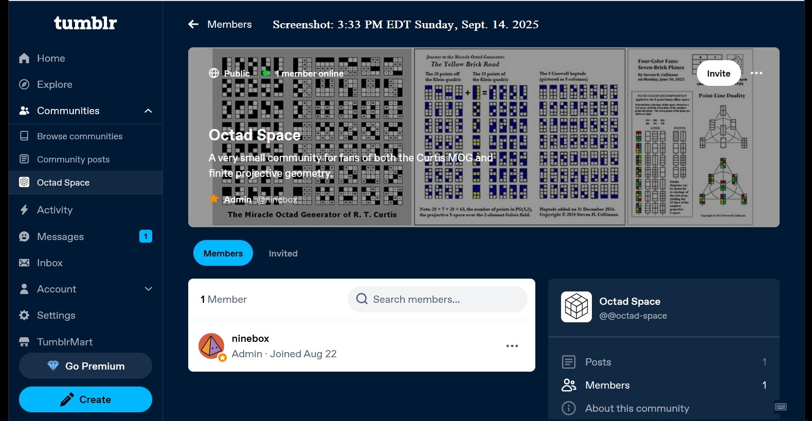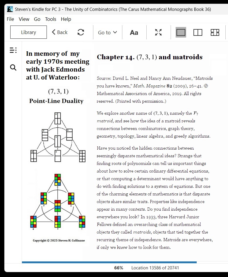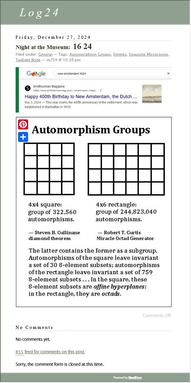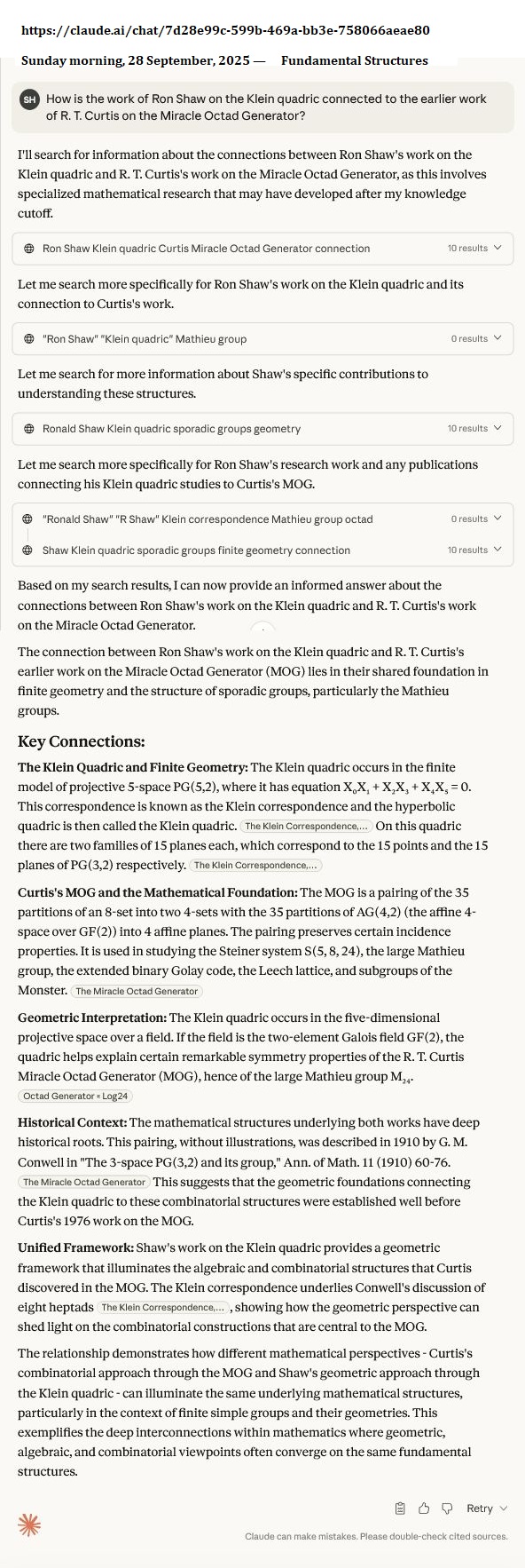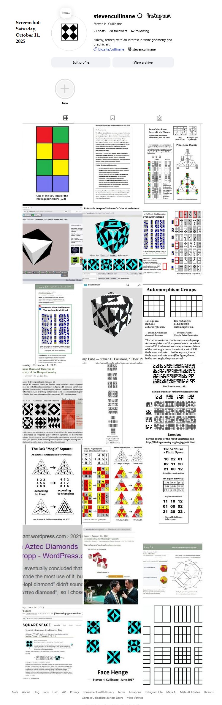 Cullinane Diamond Theorem and Symmetry in Finite Geometry by Microsoft Copilot on Wednesday, September 10, 2025 The Cullinane Diamond Theorem is a fascinating result in finite geometry that connects abstract mathematical structures with visual symmetry in graphic designs—like those found in quilts or tile patterns. 🧩 Core Idea At its heart, the theorem explores how finite projective geometry, specifically the projective space PG(3,2) (3-dimensional space over the finite field GF(2)), underlies the structure and symmetry of certain 4×4 arrays of tiles. 🔷 The Diamond Figure Imagine a 4×4 grid made of two-color diagonally-divided square tiles that form a picture of four diamonds. This picture is called the diamond figure D. A group G of 322,560 permutations acts on this figure. These permutations include: Swapping rows and columns Rearranging the four 2×2 quadrants 📐 The Theorem Every image of the diamond figure D under the group G has some ordinary or color-interchange symmetry. This means that no matter how you permute the tiles using the rules of G, the resulting pattern will always retain some form of symmetry. 🔭 Geometric Interpretation The 840 distinct patterns generated by G can be grouped into 35 structures, each corresponding to a line in PG(3,2). Each such line can be represented by a three-set of line diagrams, where each diagram is the binary sum of the other two. The 15 basic line diagrams correspond to the 15 points of PG(3,2). 🧠 Why It Matters This theorem shows how deep mathematical principles—like automorphism groups and projective geometry—can explain the symmetry in designs that have existed for centuries. It also links to advanced structures like the Miracle Octad Generator and even the Leech lattice, which plays a role in sphere packing and error-correcting codes. If you’re intrigued by the intersection of math and art, this theorem is a beautiful example of how abstract algebra and geometry can illuminate visual harmony. |