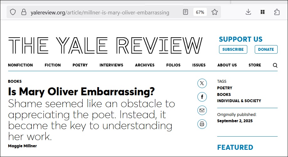 "But the first thing I felt when rereading Oliver’s work was frustration. Though almost uniformly straightforward and sincere, her poetry is vastly uneven in quality, demonstrating little thematic or stylistic growth over the long arc of her career. In the dullest poems, her trademark simplicity can seem like the result of lazy writing, bloated with abstractions that hurry the reader toward unearned epiphany. It wasn’t just that these poems didn’t require all my hard-won hermeneutic tools to be understood; it was that they seemed to actively thwart them, resisting my scalpel like polished stones." — Maggie Millner |