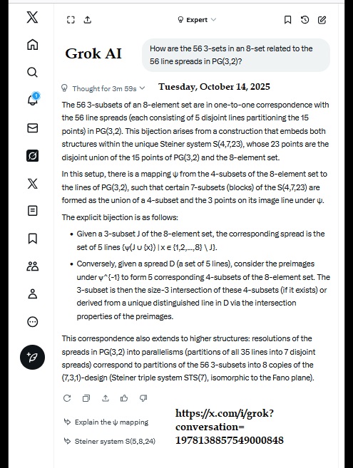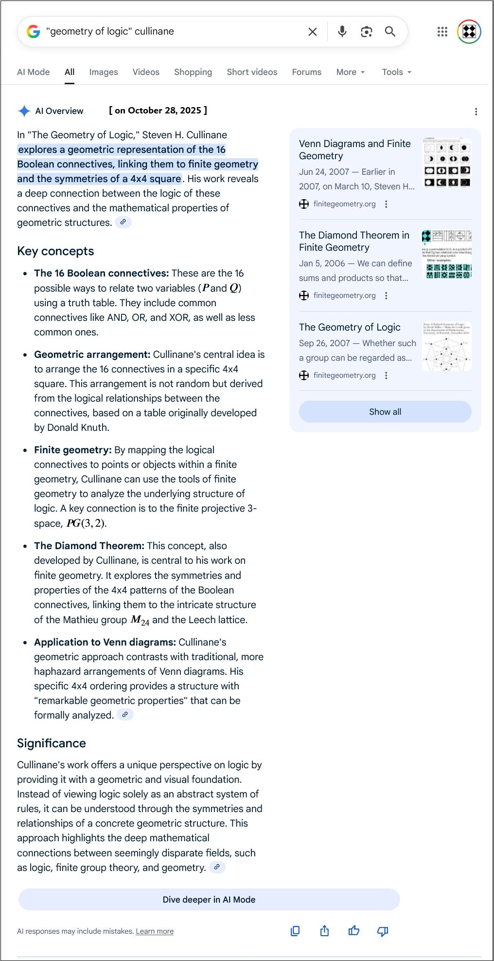 In essence, finite geometry, exemplified by the Cullinane diamond theorem, acts as a "portal" that unveils profound mathematical structures underlying seemingly simple patterns, demonstrating the interconnectedness of geometry, algebra, combinatorics, and visual art, with significant implications for fields ranging from error-correcting codes to experimental design and signal processing. * This AI statement is false. See "Origin," Sept. 20, 2025. |