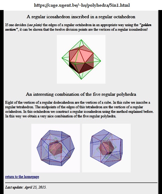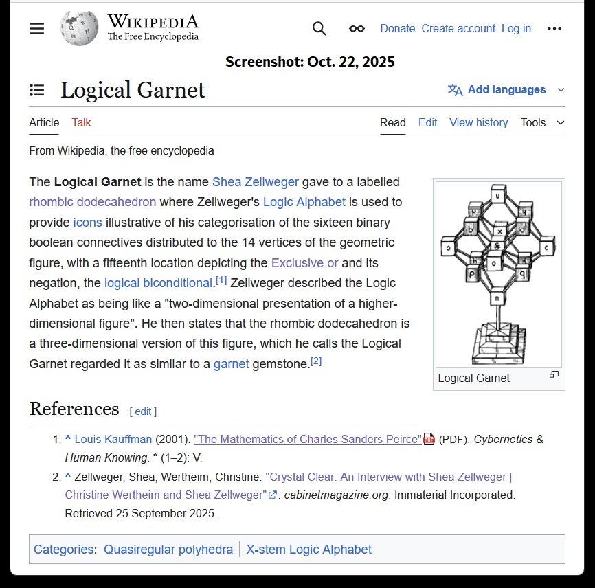 Louis H. Kauffman on the Logic Garnet — "This is a remarkable connection of polyhedral geometry with basic logic. The meaning and application of this connection is yet to be fully appreciated. It is a significant linkage of domains. On the one hand, we have logic embedded in everyday speech. One does not expect to find direct connections of the structure of logical speech with the symmetries of Euclidean Geometry. It is the surprise of this connection that appeals to the intuition. Logic and reasoning are properties of language/mind in action. Geometry and symmetry are part of the mindset that would discover eternal forms and grasp the world as a whole. To find, by going to the source of logic, that we build simultaneously a world of reason and a world of geometry incites a vision of the full combination of the temporal and the eternal, a unification of action and contemplation. The relationship of logic and geometry demands a deep investigation. This investigation is in its infancy."