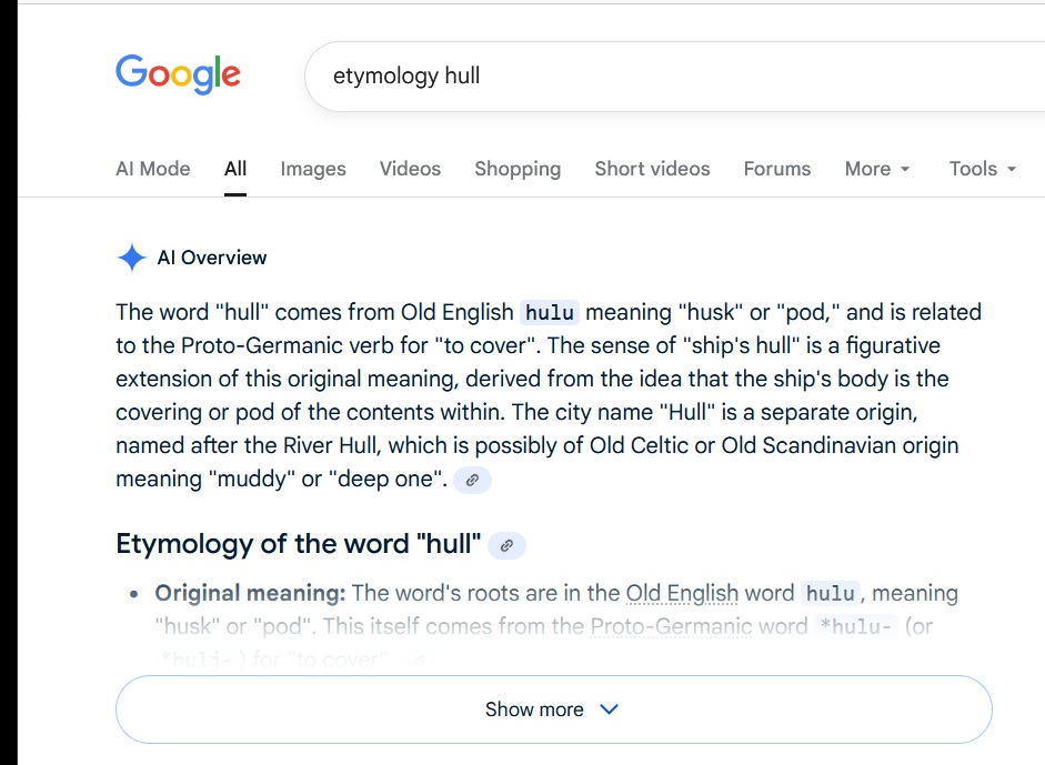 AI Overview: "The word 'hull' comes from Old English hulu meaning 'husk' or 'pod' …."