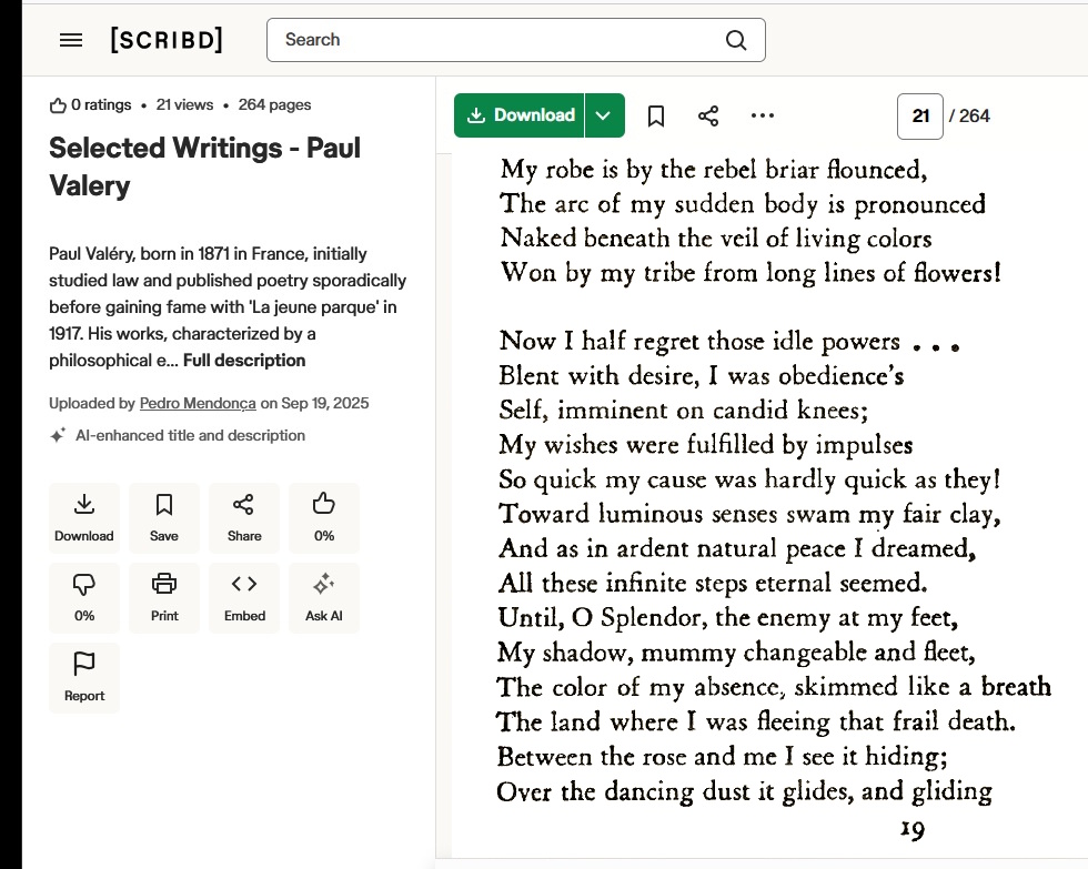 https://muse.jhu.edu/pub/1/article/663593/pdf From La Jeune Parque by Paul Valéry Ned Balbo The Hopkins Review Johns Hopkins University Press Volume 10, Number 2, Spring 2017 pp. 168-178 In lieu of an abstract, here is a brief excerpt of the content: Paul Valéry's La Jeune Parque is widely considered one of the most important poems of the twentieth century, yet it's one that few American readers know. It's easy to see why. The poem is written in the French heroic line—rhymed alexandrines (hexameters)—held together by extraordinary attention to syntax, enjambment, and pacing. Most of the line breaks correspond to natural syntactic turns or punctuation, many are end-stopped, and well-placed caesuras abound (as we'd expect in hexameters). It is difficult to produce an English equivalent that conveys the original's elegance and fluency. Add to these factors a narrative in which nothing much happens, at least not in the usual sense: A young woman stands outside on a starry night, overlooking the ocean, contemplating her connection to time, death, and the natural world as day approaches. In Jacques Duchesne-Guellemin's summary, the Young Fate "presents herself to us with her thoughts, her memories, her questionings, all on the verge of tears; bristling, listening to her own heartbeats; blushing with shame or pale with fainting" ("Introduction to La Jeune Parque," Yale French Studies 44: 1970). Despite Valéry's success in depicting shifting emotional states through vivid metaphor and images, this is not a recipe for easy reading. Yet the poem's influence—and its author's—are undeniable. Writing in the June 1982 Critical Quarterly, Tony Pinkney observed, "Few writers commanded as much of T. S. Eliot's critical attention as did Paul Valéry.… Eliot was convinced that it was Paul Valéry 'who will remain for posterity the representative poet, the symbol of the poet, of the first half of the twentieth century—not Yeats, not Rilke, [End Page 168] not anyone else.'" Eliot's introduction to Valéry's The Art of Poetry (Bollingen edition) confirms his admiration for the poet some call "the last symbolist"—"Valéry in fact invented, and was to impose upon his age, not so much a new conception of poetry as a new conception of the poet"—and Eliot further maintains that Valéry's two greatest poems (La Jeune Parque and "Le Cimetière Marin") are "likely to last as long as the French language." Eliot is not the only world poet Valéry influenced. Tony Brinkley points out that echoes of "Le Cimetière Marin" are present in the "oceanic rhythms" of Wallace Stevens poems such as "An Ordinary Evening in New Haven," and he also reminds us that one of Rilke's last creative projects was to translate the poetry of Valéry ("Reading Valéry in English," Cerise Press 3:7, 2011). But not La Jeune Parque, which, according to Rilke, was "untranslatable … (if only someone could convince us otherwise!)." Years later, in response, Paul Celan attempted to do just that in Die junge Parze, a version that was more Celan's than Valéry's. The Young Fate has found her way into Italian and Spanish versions, too. For those seeking a look at early editions, MoMA's permanent collection includes a beautiful 1921 edition published in Paris by Revue Nouvelle Française with a lithograph by Picasso. La Jeune Parque has attracted several translators to English. The versions most widely available are those by David Paul (in Paul Valéry: An Anthology, Princeton University Press, 1976), and a version by Jackson Mathews (in Selected Writings of Paul Valéry, New Directions, 1950/1964). Both follow Valéry's pace in English texts that literally parallel the original—in part because the original's rhymed alexandrines, and the poem's length, are central to the ways that Valéry's thought unfolds. To alter the pacing would undermine the poem's intensity—the way its speaker responds to constantly changing perceptions. But the differences are instructive: Paul's version ("The Young Fate") is faithful to the author's content in unrhymed lines that fall loosely into pentameter or hexameter, while Mathews's "Fragments from 'The Youngest of the Fates'" accepts the challenge of producing [End Page 169] an English version in smoothly rhymed heroic couplets. To a…. |