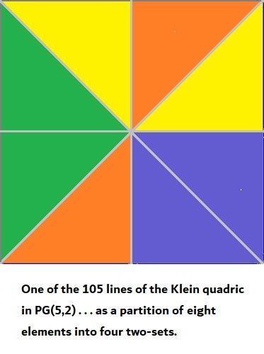. This same framework connects to the 105 partitions of an 8-set into four 2-sets, which are essentially the same as the 105 lines contained in the Klein quadric