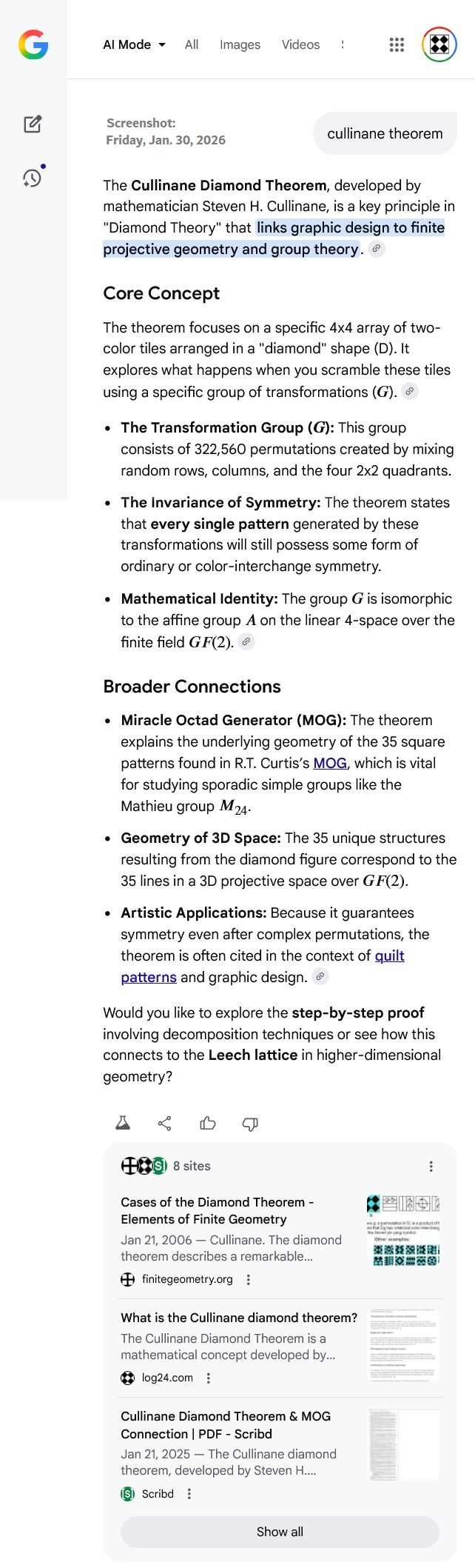 The Cullinane diamond theorem establishes a profound link between visual 4×4 patterns and advanced mathematical structures such as finite geometry and group theory. By analyzing symmetry-preserving transformations within a group of 322,560 permutations, the research connects simple grid designs to the complex projective space PG(3,2). These geometric frameworks further extend into coding theory, illustrating how "diamond" rings are isomorphic to matrix algebras over the finite field GF(4). The sources also highlight the Miracle Octad Generator (MOG) and its relationship to the Mathieu group M24, which is essential for understanding error-correcting codes and sphere packings. Beyond pure mathematics, the text explores "brick space" and the Klein correspondence, suggesting that these abstract symmetries represent a "universal" order found in both art and nature. Ultimately, this body of work bridges the gap between ancient motifs and modern computational science through the elegant study of structural invariants.